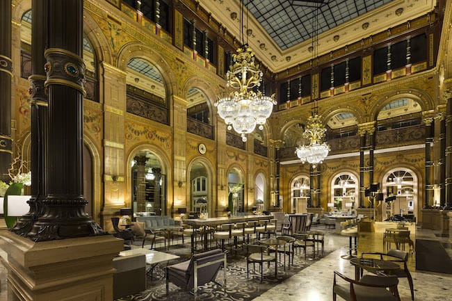 Previously, the reception desks were parked at the back of the Salon so people were constantly trudging through the public space with their luggage. To change that, Hilton placed the check-in area on the landing above the front stairs leading into the Salon, and replaced what was once reception area with a full length bar. Now the Salon’s communal space is purely for networking and socializing, surrounded by the exquisitely restored Belle Epoque decor rescued from decades of neglect.