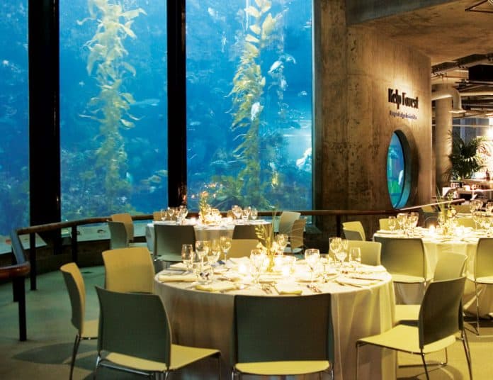 Attendees enjoyed ahi poke nori canapes and tomato bisque shooters while wandering past illuminated tanks of moon jellies and getting their photos taken in front of sea-themed photo backdrops. Coq au vin filet of beef was served in the Open Sea Galleries in front of the 90-foot aquarium wall, through which attendees could spot tunas and sharks swimming past glittering schools of sardines, and a dance party with a local DJ ended the night with the energy of hits from the 80s, 90s and today.