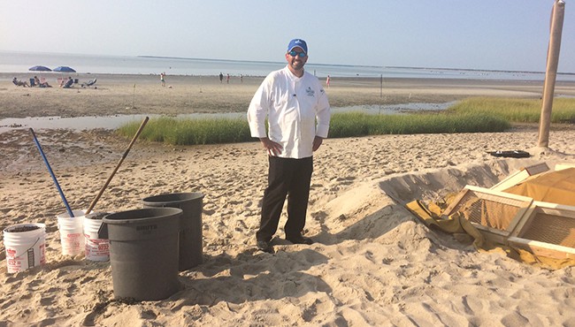As we crossed the boardwalk to the private beach at Ocean Edge Resort, we came upon the quintessential Cape Cod summer scene: a clambake, with the fresh catch steaming away in a huge pit dug deep into the sand, long plank tables adorned with simple sunflower centerpieces, and a setting sun over the Brewster Flats at low tide.