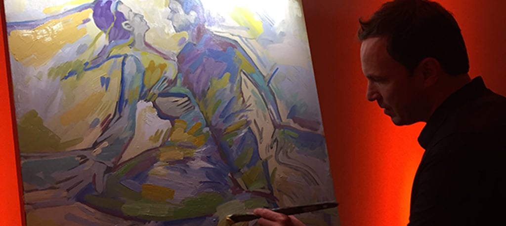 New Orleans artist John Bukaty never knows what he is about to paint when he gets in front of a group. At the recent Incentive Research Foundation live auction event at the Trump National Resort Doral in Miami, he created a sensual moment between a couple as they danced, their bodies vibrant splashes of purple, blue and lime green. The piece was auctioned off to raise money for future incentive research. “I just loved the sense of movement in his painting,” said Lari Kircher, owner of Frangipani Beach Resort in Anguilla, who then purchased the piece at the auction and is speaking with him about creating others for the property.