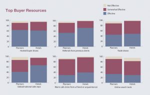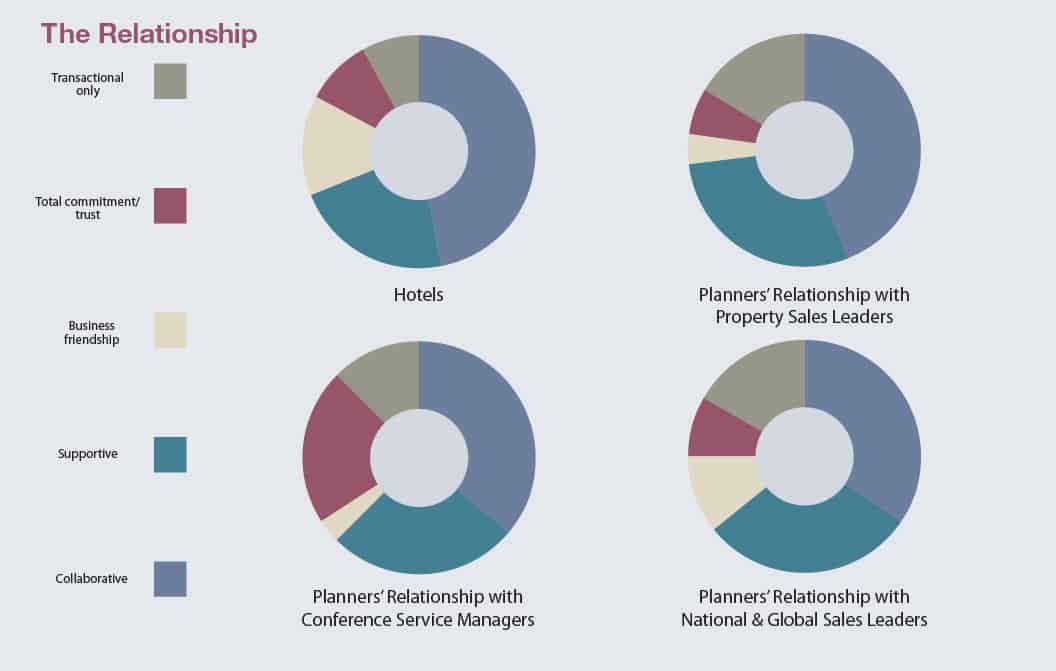Significant differences were also found in the perception of the planner-hotelier relationship itself—whether each viewed the other to be “business friends” or business as usual. As it turns out, hoteliers are more likely to view planner customers as business friends, while planners when referring to their property salesperson and CSMs used that description infrequently. In fact, 15 percent of planners described their relationship with their hotel sales people (and global/national sales reps) as “transactional only.”