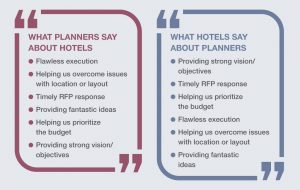 It’s clear from the survey results that hotels look to their meeting planner partners for strategic direction, while planners expect flawless execution from their hoteliers. Many planner respondents would like to see hotel counterparts expand their roles beyond logistics, educate themselves and their staffs on the program and become stronger partners.