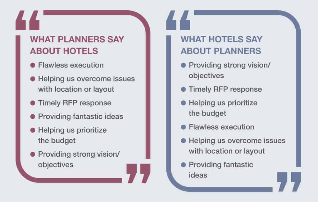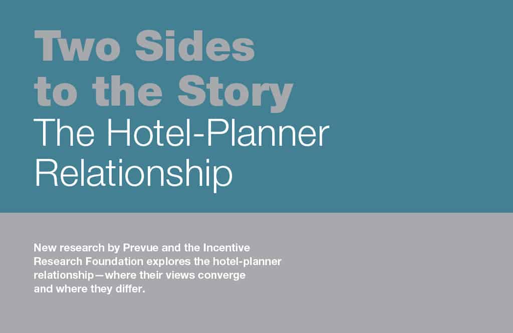 Talk to any planner or hotel sales person and they will tell you that the meetings industry is a relationship business. We teamed up with the Incentive Research Foundation to put that statement to the test with the first-ever survey asking both sides the same questions about how they work together. Conducted this past July, our meetings research is based on the responses of 160 meeting planners and 126 hotels, ensuring a 95 percent confidence rate in the results and a +/- 8 percent confidence interval. (More meetings research here.)