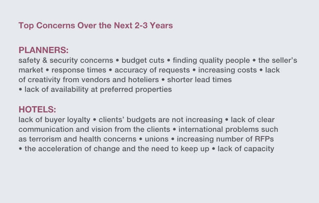 The pressures on both sides—planners and hoteliers—are enormous, as was revealed in the comments they shared when asked about the top issues affecting their ability to do their jobs.