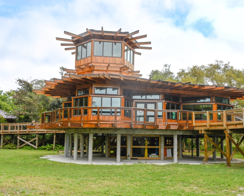 Looking for a place to brainstorm or network in nature? Escape distractions with a meeting at the NEST (short for Nature, Exploration, Science, and Technology). Perched off the ground, this unique event space at nearby Robinson Preserve lives up to its name and features an outdoor deck and observation tower for panoramic views of the 600+ acres of coastal wetlands.