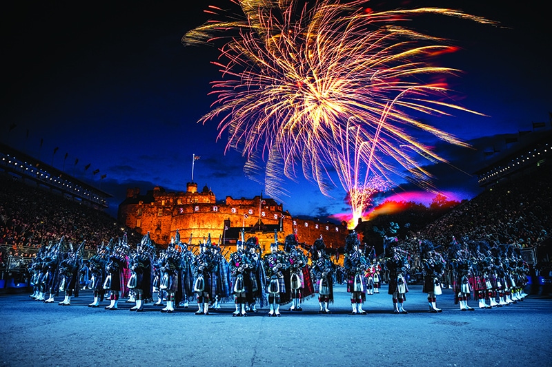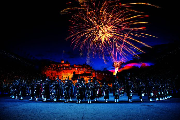 The arena at the Edinburgh Military Tattoo during a performance of the military event, parade ground and packed spectator seating. A light show projecting onto the castle walls. Marching band with a leading conductor, and massed pipers playing the bagpipes. Fireworks exploding in the night sky.
