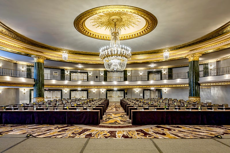 The hotel boasts over 45,000 sf of meeting space and can host up to 1,000 attendees. The largest space is the Grand Ballroom, which features a six-ton Bacarrat crystal chandelier and hand-painted murals that were restored by Lido Lippi, who had previously worked on the restoration of the Sistine Chapel.