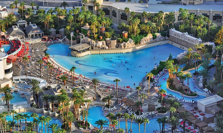 Mandalay Bay Beach is a tropical water and sand playground that sprawls across 11 acres and features a 1.6-million-gallon wave pool, which can generate waves up to six feet high. The beach also offers a lazy river, four distinct swimming lagunas, several whirlpools and a jogging track. Planners can reserve their choice of cabanas, bungalows or gazebos located either directly on the beach, by the lazy river, or the swimming pools, and accommodating groups of 6-12. Dining options include the Beach Bar & Grill serving light bites, as well as several bars. The versatile space can accommodate everything from a beach BBQ by day to a private concert by night.