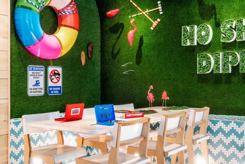 Additionally, the iconic happy hotel carries their love for fun into the lobby and event spaces with a giant camper, a pool-inspired lounging area with a “no skinny dipping sign,” movies always playing for guests in the lobby, giant connect board games throughout the hotel and lots of fun murals on each floor’s landing.